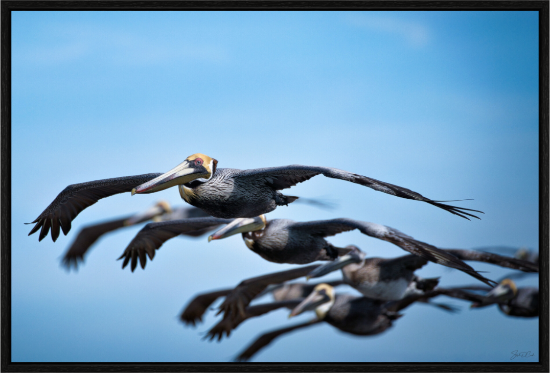 On April 7, 2024, off Vilano Beach, a flock of pelicans traced the shoreline sky. The sharp focus on the lead bird reveals every detail of feather and form, while the softer rhythm of the flock behind creates a sense of depth and collective motion. This photograph celebrates the grace and determination of flight, carrying the spirit of Florida’s coast into the air of any room.